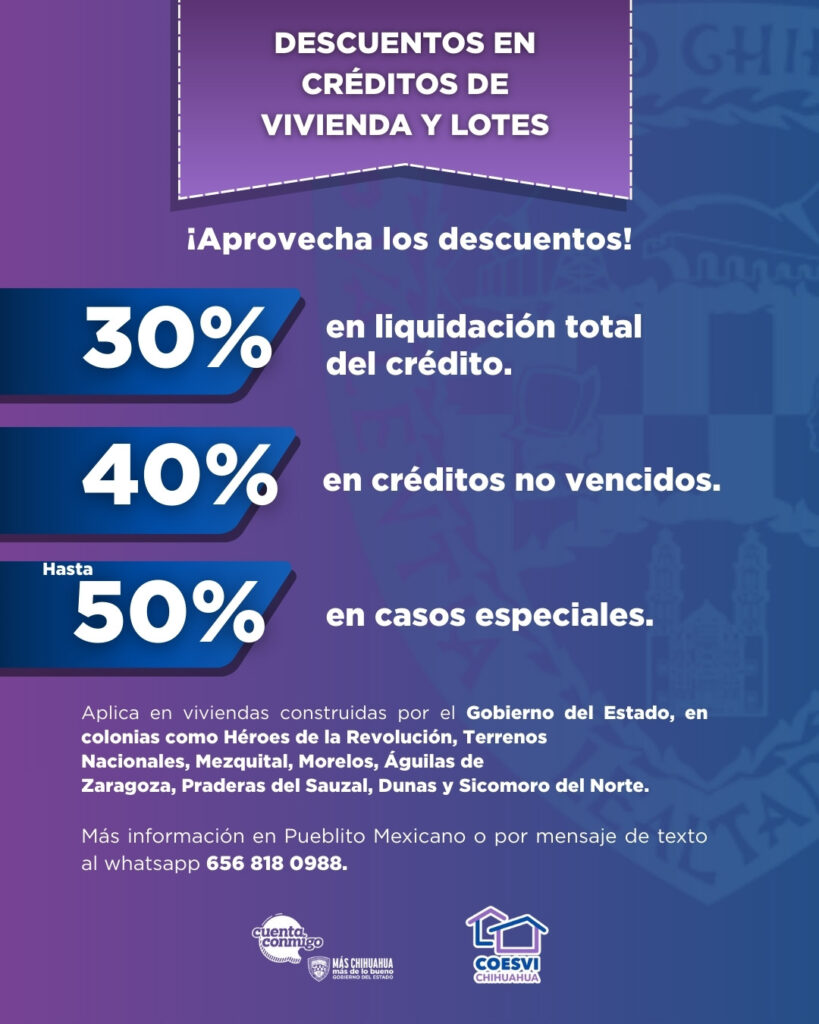 La Comisión Estatal de Vivienda, Suelo e Infraestructura (Coesvi) mantendrá durante todo el año 2026 el programa de descuentos para la liquidación de créditos de vivienda y lotes en Ciudad Juárez.
