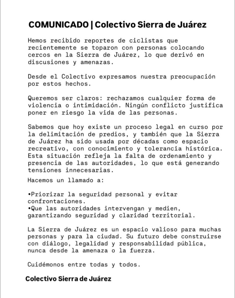 El colectivo Sierra de Juárez mencionó mediante un comunicado en redes sociales que les preocupa la intimidación que terceros puedan estar ejerciendo hacia los visitantes en la Sierra Juárez, pues han recibido reportes de ciclistas que se han topado con personas que delimitan el área con cercos, ‘’lo que derivó en discusiones y amenazas’’ de ambas partes, indicó.