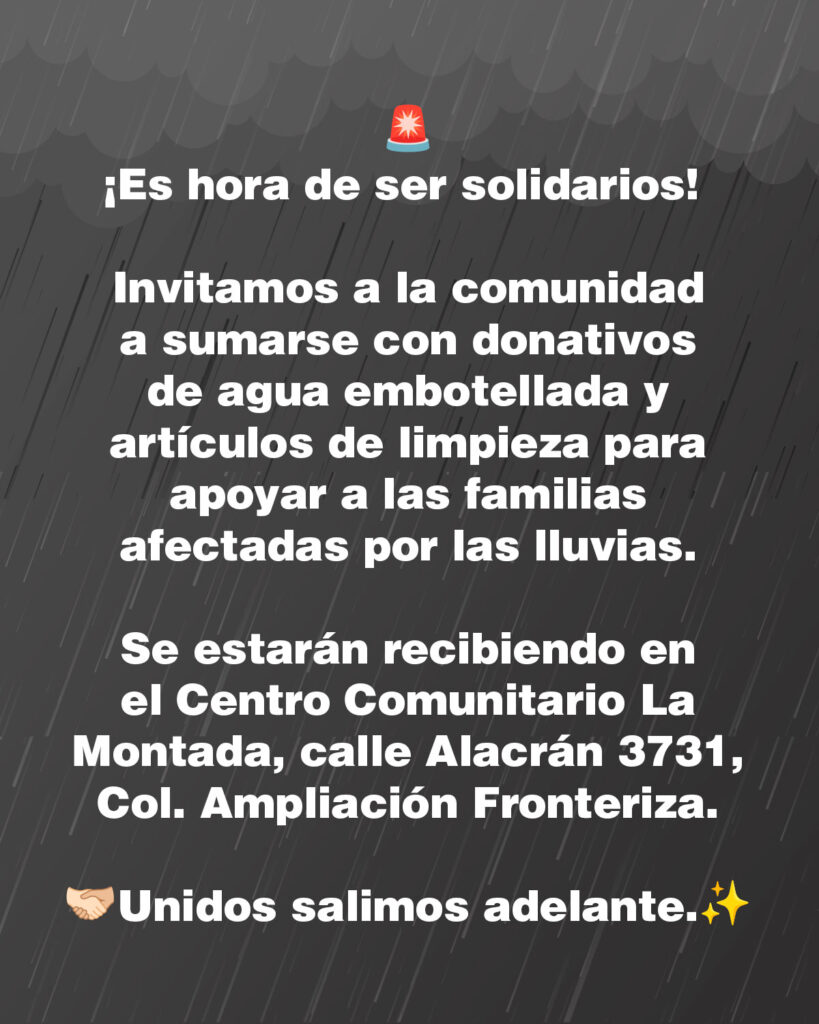 Además, desde el municipio invitan a los ciudadanos a donar aguas embotelladas y artículos de limpieza en el Centro Comunitario La Montada, calle Alacrán 3731. Colonia Ampliación Fronteriza.