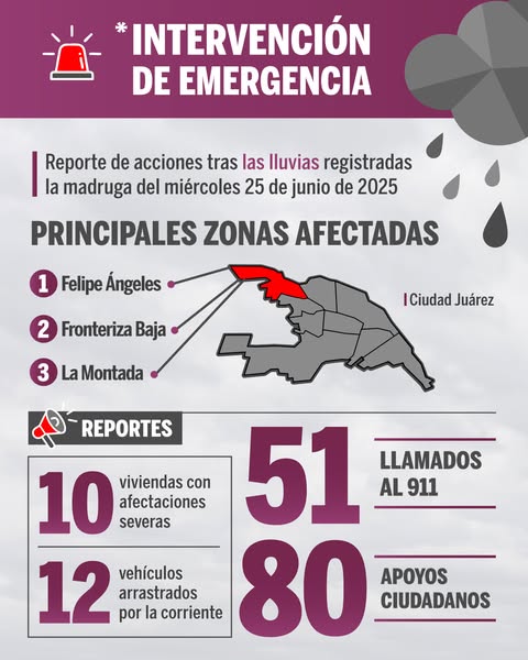 Se habilitaron albergues temporales en Ciudad Juárez como método de ayuda para las personas damnificadas que perdieron su hogar, o que se encuentren en situaciones vulnerables, tras las inundaciones en estos últimos días. El objetivo de las autoridades municipales es brindar refugio, alimento, atención médica de padecimientos crónicos y pláticas para evitar propagación de enfermedades: dengue, gastroenteritis y enfermedades fúngicas.