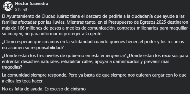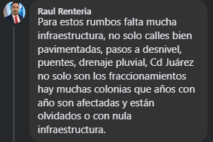 No obstante, después de que el municipio pidiera solidaridad a los ciudadanos, muchos se mostraron descontentos con el trabajo de las autoridades; mencionan en redes sociales múltiples quejas indicando el mal manejo del presupuesto de egresos 2025 para Juárez, el cual se enfoca en otros aspectos antes que, el reparo y el cuidado de toda la mancha urbana incluso desde hace décadas.